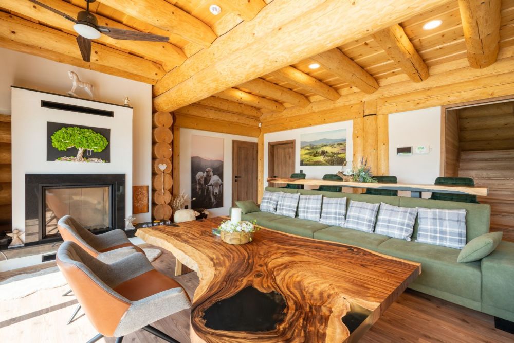 Přemíra prostoru v domě i na zahradě mě nepřestává fascinovat. Je tu tolik krásných zákoutí, že sama nevím, kde bych byla dříve. V průběhu rozhovoru však zjišťuji, že dům jako celek dokonale vystihuje Janinu povahu. „Malé prostory mi jednoduše nedělají dobře, v bytě bych nevydržela. Z toho důvodu jsme si srub nechali zvýšit asi o tři klády, abychom měli vyšší stropy. Své udělal i přírodní nátěr světlé barvy, který dům opticky zesvětluje a dělá ho vzdušnějším. Co se týká interiéru, spodní část jsme nechali na interiérových designérkách, patro jsme si ladili sami. Máme rádi zelenou barvu, kterou se nám myslím podařilo perfektně zakomponovat a podpořit dřevo, jako přírodní materiál." A to mohu potvrdit. Zelená barva byla přiměřeně aplikována na kuchyňskou linku, závěsy a sedací soupravu. Příjemnou atmosféru tu v zimním období příležitostně dotvářejí i krbová kamna. „V nich opravdu stačí zatopit jen pár polínky a je tu rázem teplo, které srub dlouho udrží."