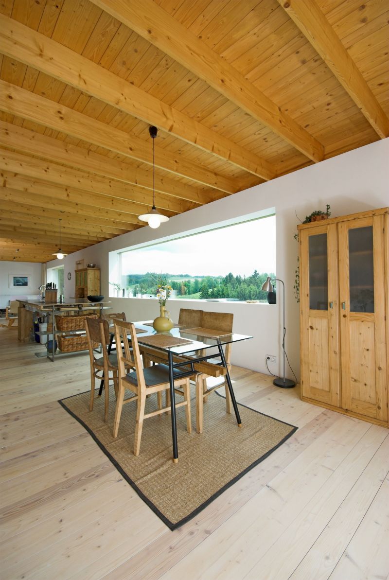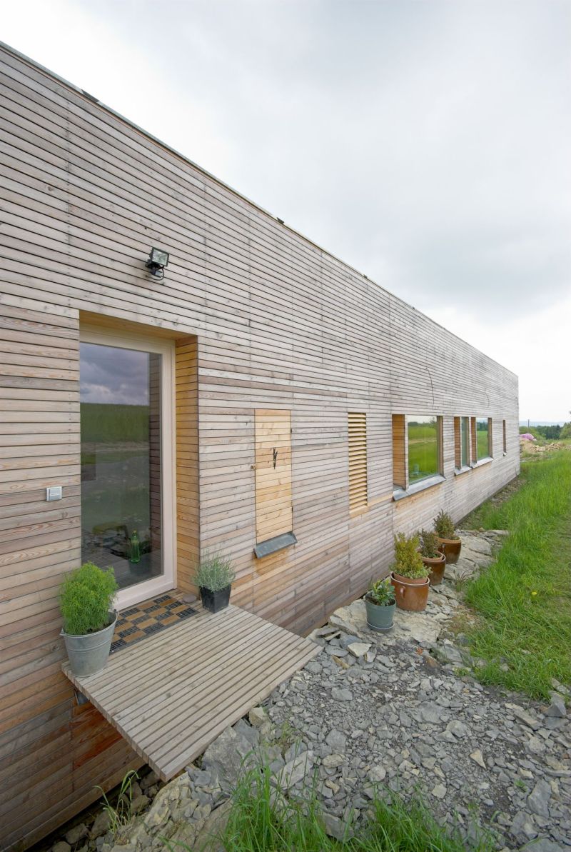 Fasáda domu je opláštěna zavěšenou provětrávanou fasádou z modřínového dřeva a vytváří tak poměrně homogenní plochu, kterou nenarušují ani rámové konstrukce okenních výplní. Bezrámová velkoprostorová okna tvořená trojskly velkoryse otevírají výhledy do okolní krajiny a interiér nadstandardně prosvětlují. Dokonale se tak stírá pocit stísněnosti.