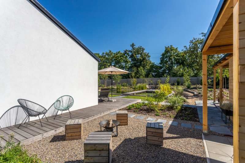 Každý den v průběhu realizace jsme se chodili dívat, co je nového, a byli z procesu nadšeni. Party řemeslníků se střídaly, navazovaly na sebe a objekt se rychle měnil před očima. Tahle podívaná doslova měnila náš úhel pohledu a neblahou zkušenost s řemeslnými profesemi. Jelikož bylo možné financování postupně podle míry zhotoveného, zvolili jsme variantu prodeje našeho původního domu během výstavby. Byl to adrenalin, ale kupodivu nám vyšel perfektně. Peníze přišly akorát před splátkou. Klapl nám i plán ponechat si část financí na zahradu a jezírko. Jsme moc rádi, že jsme celý proces zvládli bez hypotéky.