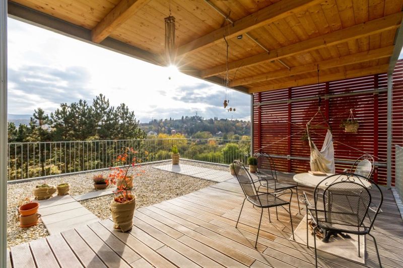 „Dnes si tuto volbu nemůžeme vynachválit," pochvaluje si Marie. „Obytná zóna je prakticky na roveň korunám borovic u hranice pozemku a z obýváku i terasy tak máme fantastický výhled. Mám pocit, že náš dům je takto mezi všemi živly. Za zády máme skálu, vidíme na Berounku, krbový oheň je na jihu a všude kolem dřevo. Mám pocit, že tady je všechno tak akorát."