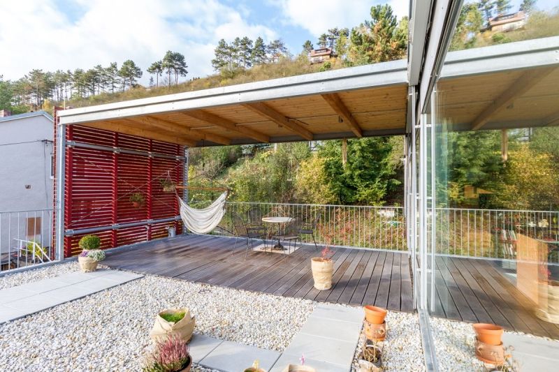 Vzhledem ke svažitosti pozemku bylo od začátku jasné, že bez schodů se pohyb po domě neobejde. Další úvahy pak jen logicky směřovaly k řešení, které uchopilo danou situaci jako příležitost k tomu bezproblémově zaparkovat a dostat se od auta do domu suchou nohou, příležitost užít si výhled do údolí Berounky a také příležitost mít k obytnému prostoru i navazující venkovní prostor a současně vnímat prostor zahrady za domem.