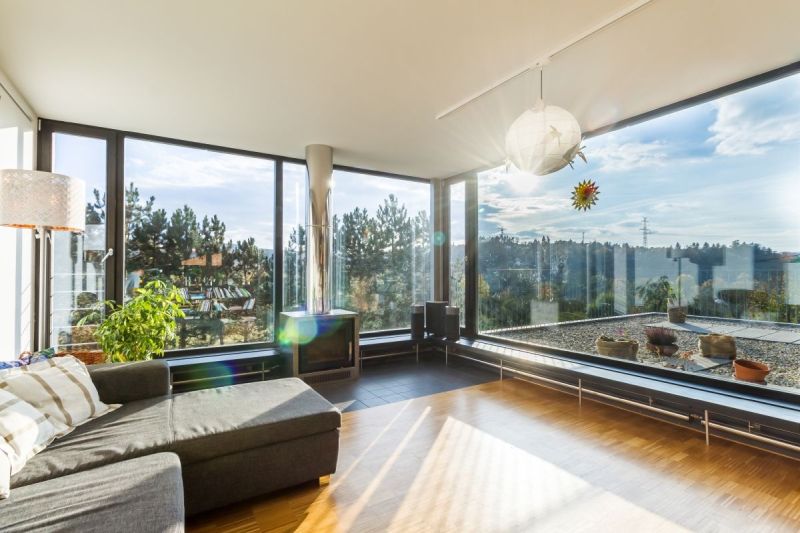 Celková plocha prosklení je o trochu více než třetina podlahové plochy bytu. Dvojskla mají obecně tu výhodu, že méně „žerou" světlo. Zvolili jsme takový typ dvojskla, který také dobře propouští tepelné záření směrem do interiéru. Slunce vám tak na jaře, na podzim a některé dny i v zimě ušetří spoustu energie na vytápění. Nezbytností je pochopitelně účinné venkovní zastínění, v tomto případě horizontálními žaluziemi.