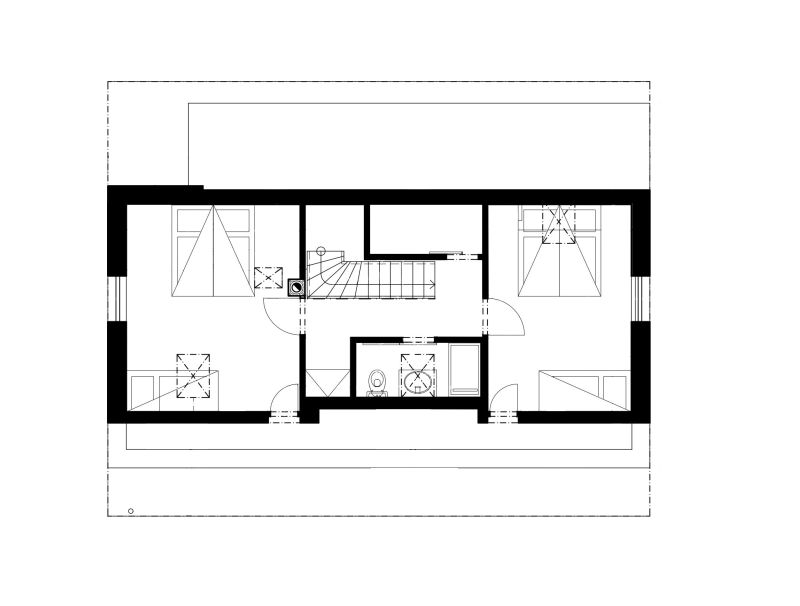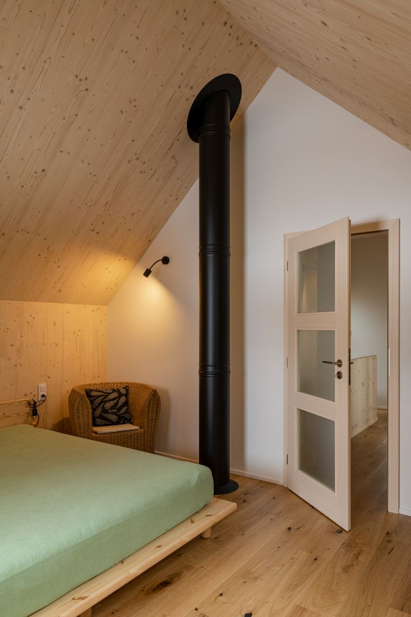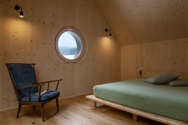 Zatímco v přízemí je situována sednice s kuchyní, pokoj, koupelna, prádelna, sauna a skládek pro sportovní potřeby, podkroví skrýv á druhou koupelnu, komoru a dvě ložnice. Právě do nich umístila architektka štítová kruhová okna, která změkčují monotónnost rovných linií a ostrých úhlů. Takové okno vždy přidá prostoru vně i uvnitř na výjimečnosti, ovšem nese s sebou i potřebu řešit atypicky otevírání a především parapet. Určitou nevýhodou může být složitá integrace stínění, pokud chceme zachovat kruhový vzhled. Naopak praktickou výhodou jsou nižší prostorové nároky okna díky absenci rohů.