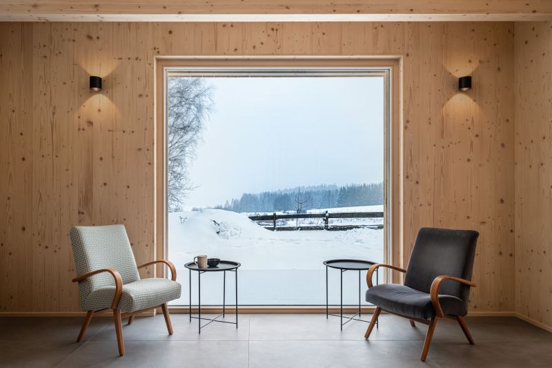 K Šumavě mám od malička silnou vazbu a v návrhu se mé prožitky a vzpomínky odráží. Zvláště ten pocit, když přijde člověk vymrzlý z výletu, dá si sušit ponožky ke krbu, usrkává horký čaj a čeká, až mu rozmrznou ruce i nohy. Kontrast nepohody s následnou odměnou v podobě komfortu je v návrhu umocněný velkým oknem, kterým se díváte na zasněženou terasu, a přitom se v teple tetelíte blahem.