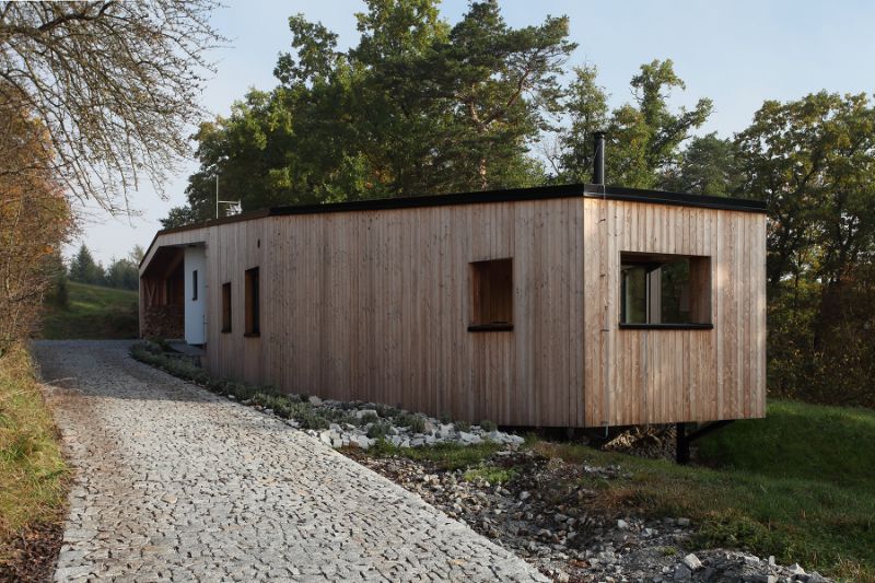Nosná myšlenka byla jednoznačně dána charakterem pozemku, a to již od první chvíle, co jsme jej poprvé navštívili. Parcela je velice unikátní svým postavením vůči lesu, který roste na její hranici, ovšem o několik desítek metrů níže. Tím pádem z pozemku máte unikátní výhled do korun stromů. Tato skutečnost spolu se sklonem terénu zformovaly jednoznačně podobu domu. Navrhli jsme řešení, které nabízí krásný výhled do lesa z každé obytné místnosti. Tvar střechy i podlahy kopíruje sklon pozemku a elegantně tak zapadá do místního reliéfu. Za příjezdovou cestou se terén zvedá přibližně na výšku jednoho patra. Jednopodlažní objekt zde takto krásně zapadá. Z domu se pak stává jakýsi poklad skrytý na konci obce nabízející romantické momenty v kontaktu s přírodou.
