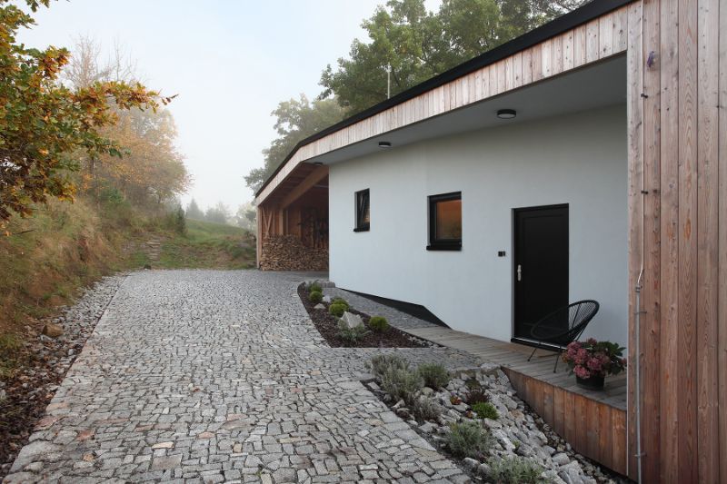 obr: Zásoby dřeva: Uložení polínek do krbových kamen zároveň kryje garážové stání a dokresluje atmosféru i výraz domu.