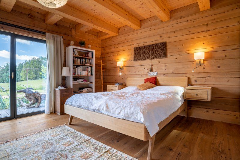 Protože se Radana naplno ponořila do nové životní výzvy, zatímco manžel byl stále ještě prací vázaný v Praze, ona se do původní chaty v podstatě přestěhovala. I díky tomu věděla, že nový dům bude také ze dřeva, ideálně z masivu. Měla ale strach z časté údržby a velkého sedání stavby v prvních letech po dokončení, až jednou náhodou nedaleko odsud narazila na deset let starou roubenku z červeného cedru, kterou si její majitelé moc pochvalovali.