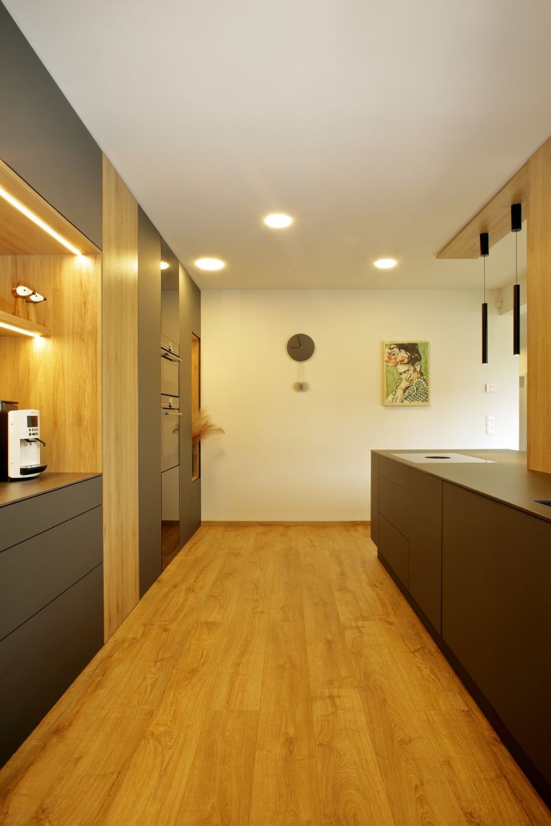 Jsem upřímně překvapena, jaká kouzla provedli sami majitelé v návrhu kuchyně, kterou následně nechali vyrobit na míru. Na první pohled mi totiž asociovala pokoj, respektive obývákovou stěnu. Tak skvěle v ní dřevo funguje. I když jsou úložné prostory a spotřebiče kryty i kontrastním tmavošedým laminem, dubová textura si bere veškerou moji pozornost.
