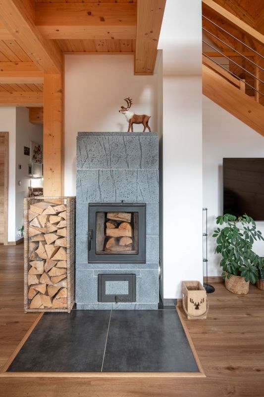 - Vytápění: tepelné čerpadlo, podlahové teplovodní topení, mastková kamna s akumulační vložkou