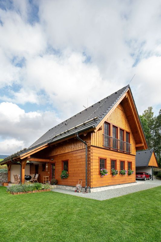 - Konstrukční systém: přízemí roubená konstrukce z lepených smrkových trámů, podkroví montovaná dřevostavba