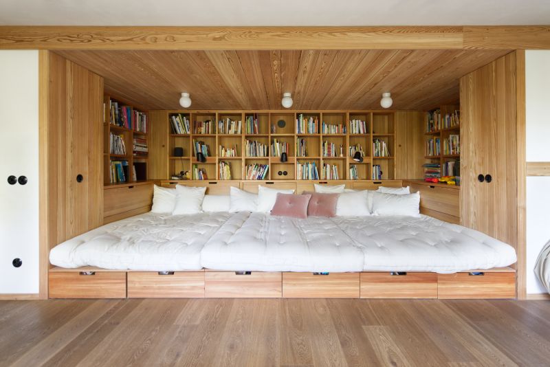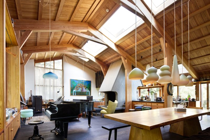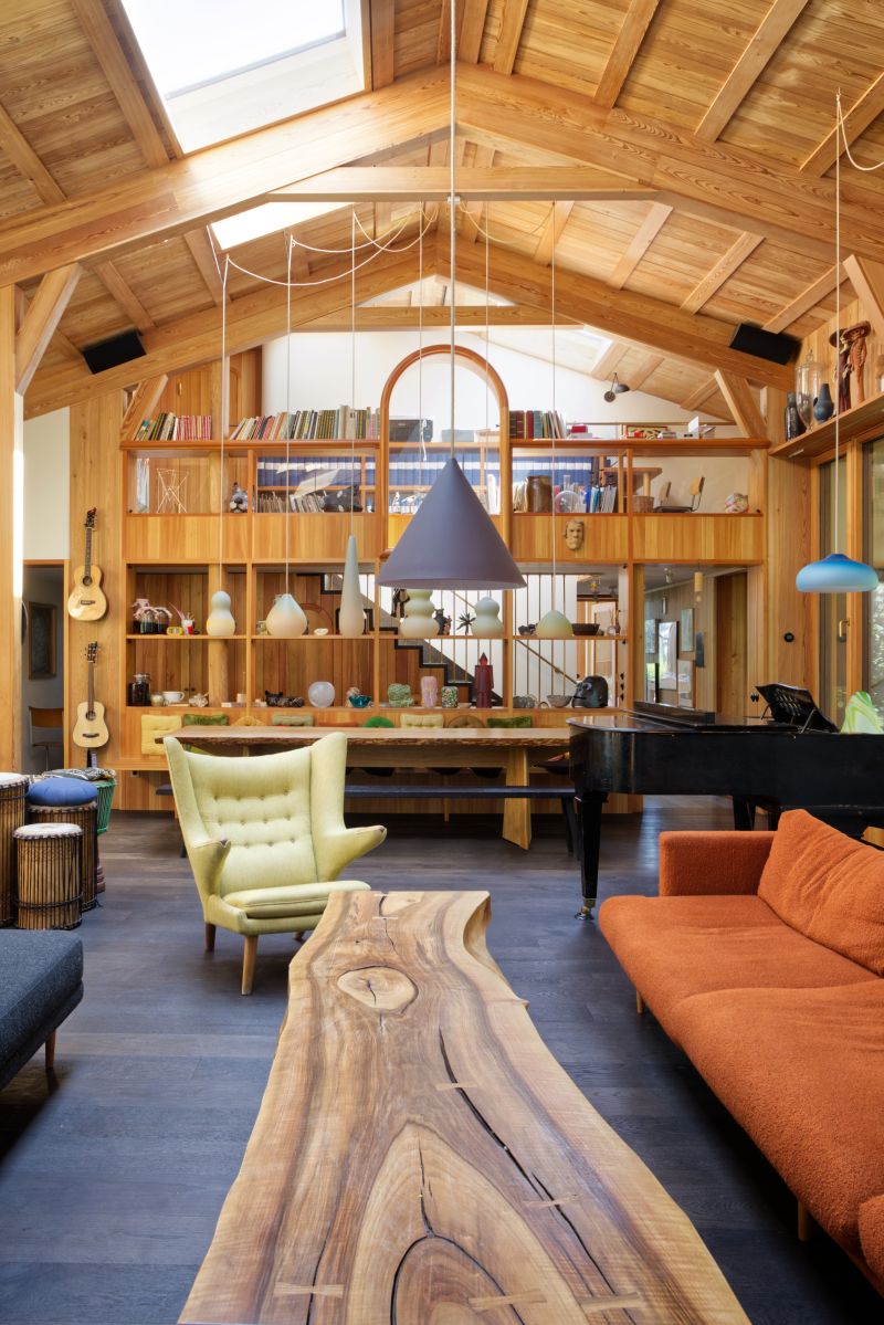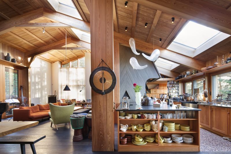 Velké zastoupení dřeva v interiéru logicky navazuje na modřínovou konstrukci a dává monumentálnímu centrálnímu prostoru uchopitelné proporce a hřejivost. Halka a Dušan jsou kromě umělců také vášnivými kuchaři, posluchači hudby, vyznavači alternativní kultury všeho druhu a také sběrateli kuriozit. Propojením dvou ateliérů jsme společně vytvořili velkorysý obytný prostor, jehož dominantou je oheň – betonový krb s otevřeným ohništěm a integrovaná akumulační kamna a současně prostor pro solidní plynový sporák ze strany opačné.