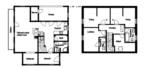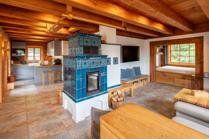 - Zdroj tepla: podlahové topení a kachlová kamna