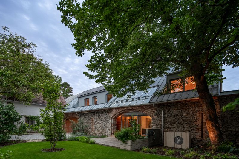 Náměstí malého středočeského města, které se pyšní bohatou historií, obklopují různorodé domy. Žádný z nich ale nevypadá jako dřevěná novostavba, kterou hledám. Přece jen tu ale je, jen dokonale ukrytá za nenápadnými šedými vraty. Jakmile jimi projdete, pohled na moderní dřevostavbu vestavěnou do více než sto let staré kamenné stodoly vám vezme dech.