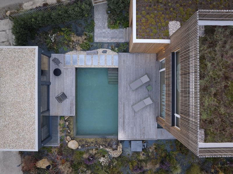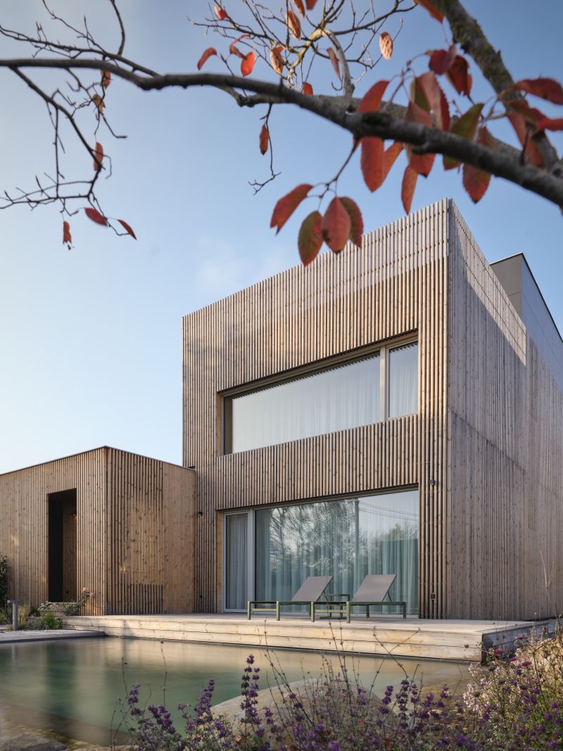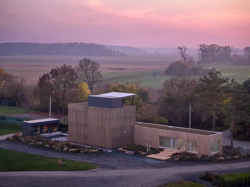 Velkoplošně se naopak otevírá v přízemí do dvora s jezírkem a saunovým modulem, ložnice v patře a střešní terasa užívají malebných výhledů do krajiny. Sauna s vysokým standardem vybavení a venkovní jezírko jsou pak místem pro relax v chladných i teplých měsících, kdy je modul využíván jako zázemí pro garden party.