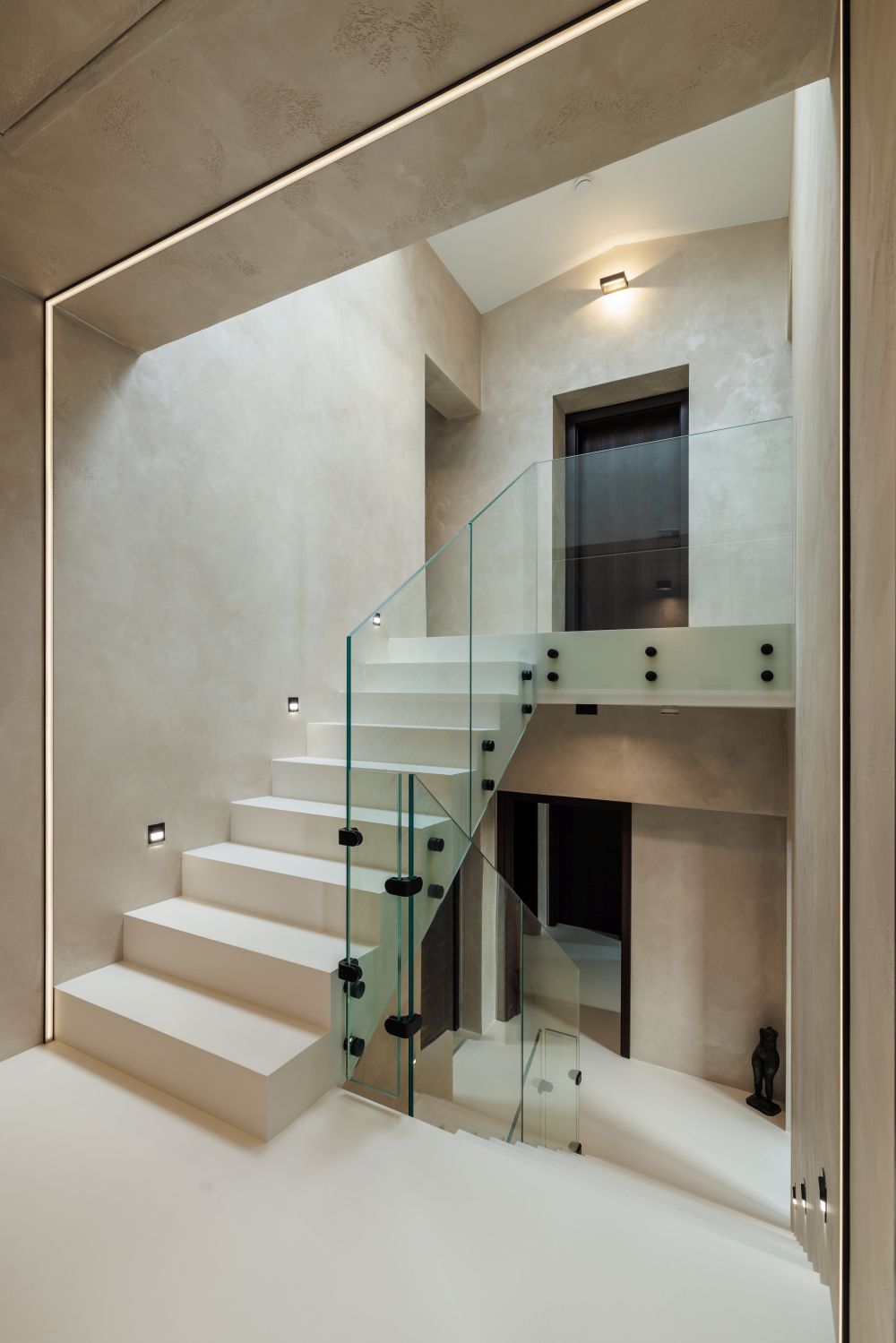 Ačkoli dům je ve skutečnosti „jen" dvoupatrový, každé z nich má díky důmyslnému propojení konstrukčních systémů dvě úrovně. Následuje tedy stále ještě přízemní šatna, dvojgaráž a technická místnost. O patro výš se nachází dva vstupy na zatím nevyužitou půdu, ložnice rodičů s nádherným výhledem a zázemím v podobě druhé šatny a koupelny.