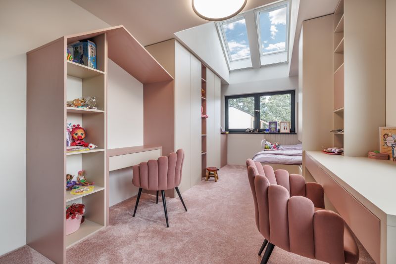 V „dětském patře" se skrývá prádelna, samostatný záchod potomků, pokoj dvojčat a společná herna. Bereničin pokoj je nejvýš a disponuje tak nejhezčím výhledem do okolí. Prostor uzavírá dětská koupelna, a jak říká Monika: „Za mě je to akorát – máme všechno, co potřebujeme, nic navíc, každou místnost využijeme."