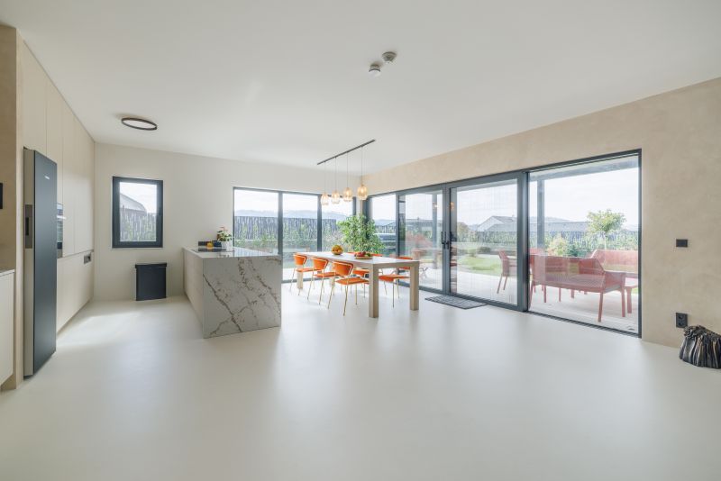 Všemi místnostmi s výjimkou sklepů vede podlahové topení napájené vodou z tepelného čerpadla, které zajišťuje dostatečný komfort celému domu. V krbu se topí jen kvůli příjemné atmosféře. „Už jsme tu zažili tři roční období a oceňujeme, že se dům nepřehřívá. Nemuseli jsme v létě ani moc zapínat klimatizaci – jakmile slunce zapadne, během chvíle prostory vychladnou," potvrzuje Monika a přidává čerstvou zkušenost, kdy se o jarních prázdninách nemohli dočkat návratu z přetopeného hotelu.