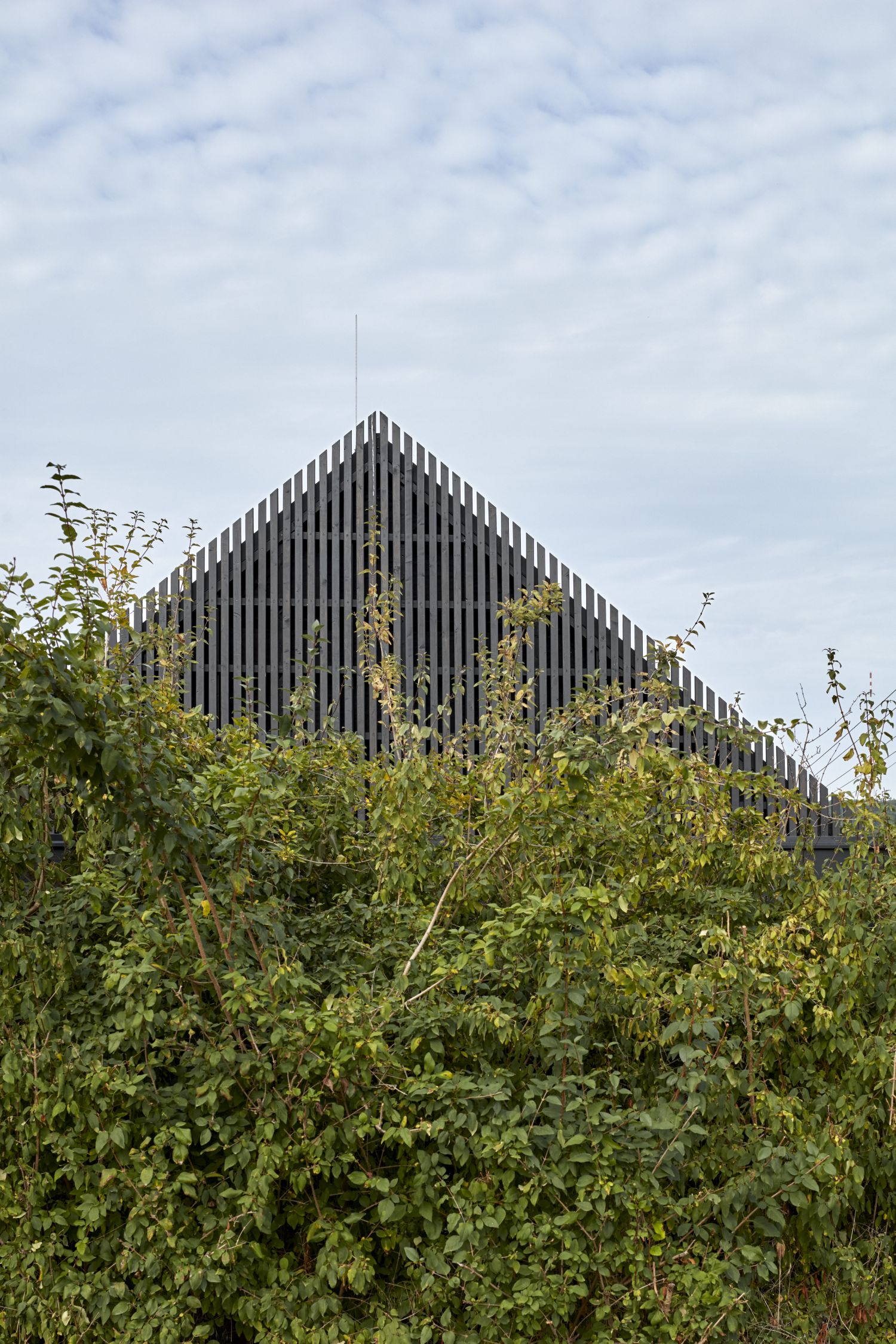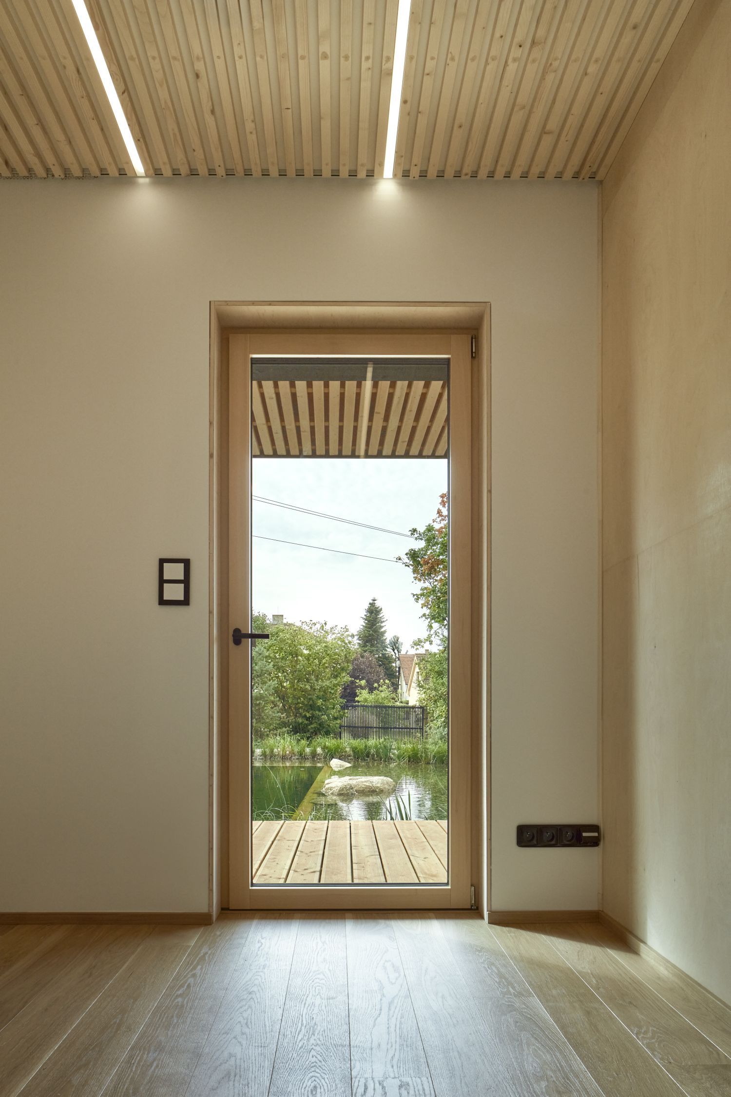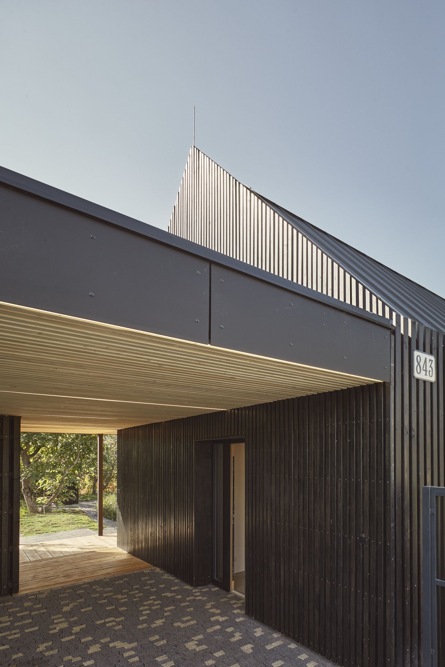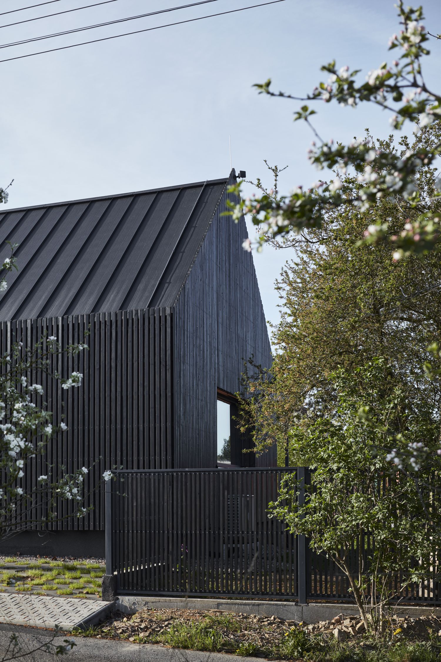 Výsledkem je dům o podlahové ploše 113 m2 s klasickou sedlovou střechou, jehož hmota je kompaktní a doplněná výrazným horizontálním prvkem přestřešení přiléhajícího k exteriérovým částem domu. Zastřešený je také prostor před vstupem i parkovací místo. Na ně navazuje sklad, sauna, a především výrazný ochoz směrem do zahrady s biotopem, který v létě rozšiřuje celkovou obytnou plochu domu. Dům ustupuje od uliční čáry na šířku parkovacího místa a jeho fasáda tvoří doslova hranu mezi prostorem venku a uvnitř pozemku.