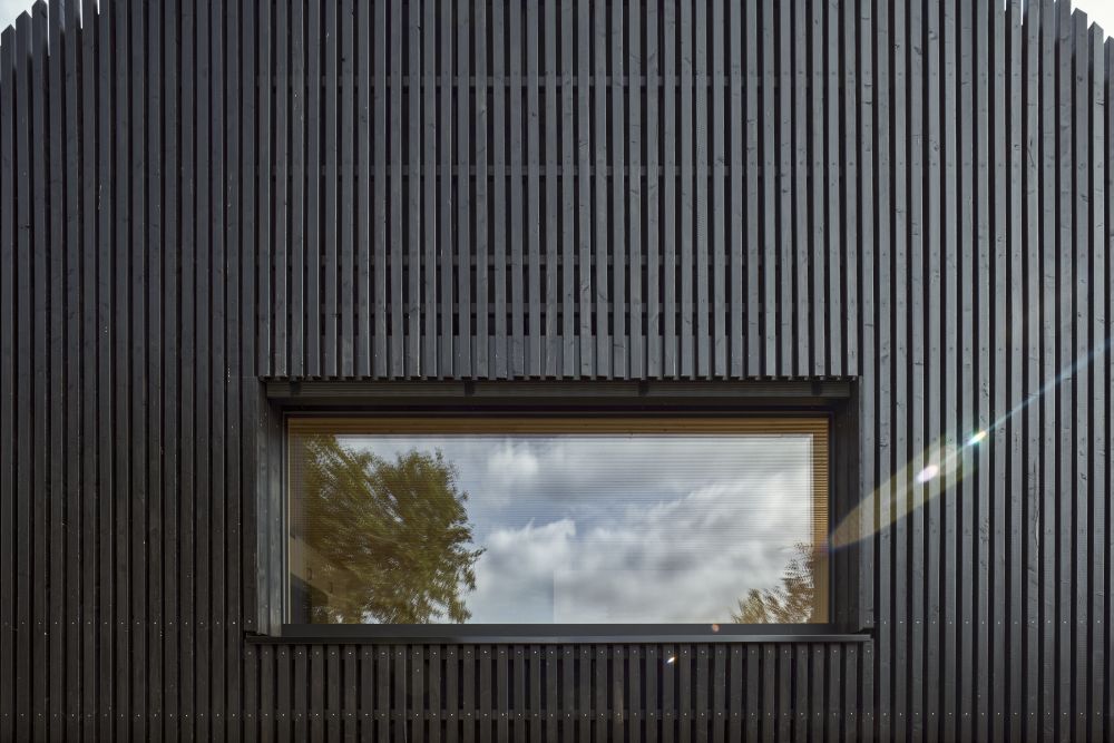 Dům je kombinací moderní čistoty s přírodními motivy a vytváří se svým okolím vizuálně ohromující celek. Důmyslně navržený exteriér, ozvláštněný černými latěmi a elegantními liniemi, tvoří nevšední komplex a skvěle komunikuje se zahradou i vodní plochou, která jí dominuje. S tmavým exteriérem domu kontrastuje světlý interiér, jehož design je navržen tak, aby kombinoval moderní estetiku s pohodlím a harmonií přírodních prvků. Všechny místnosti mají světlé omítky a dřevěné obložení, stropy jsou z laťového rastru s integrovaným osvětlením, okna i dveře jsou ze stejného materiálu jako obklad, podlahy pokrývají dřevěné lamely a dlažba.