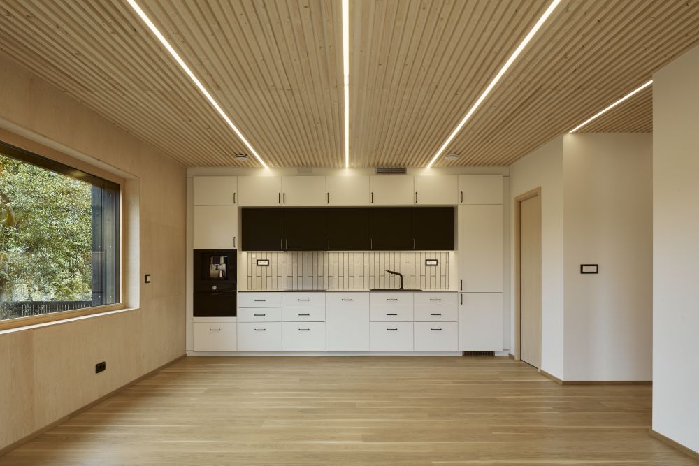 „Z důvodu vysokého radonového indexu na pozemku bylo původně zamýšleno založení stavby nad terénem. V průběhu projektování se však ukázala značná složitost tohoto řešení s ohledem na bezbariérovost. Stavba je proto založena na desce s nadezdívkami a dřevěná nosná konstrukce je až nad úrovní podlahy. Není tedy ohrožena ani v případě havárie vody v interiéru," vysvětluje Jan Koloděj z realizační firmy.