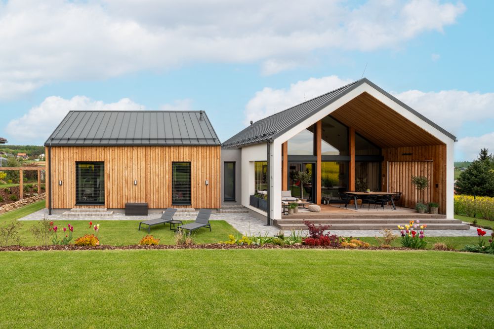Dřevěná vila schoulená v náručí krajiny