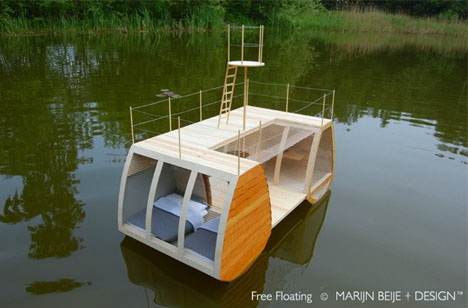 Kdo by nechtěl strávit pohodlnou noc uprostřed přírody, okořeněnou navíc ještě klidným pohupováním na vlnách jezera? Architekti ze studia Marijn Beije Design navrhli velice neobvyklý kus – solitérní pokoj, který je zaparkovaný na jezeře. Sestává se ze dvou kabin, vzájemně propojených středovou terasou – svým tvarem tak silně připomíná katamarán. V jedné kabině je umístěná ložnice, v té druhé koupelna se sprchou a záchodem.
