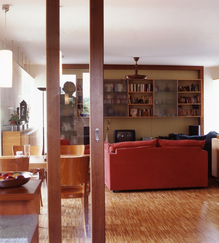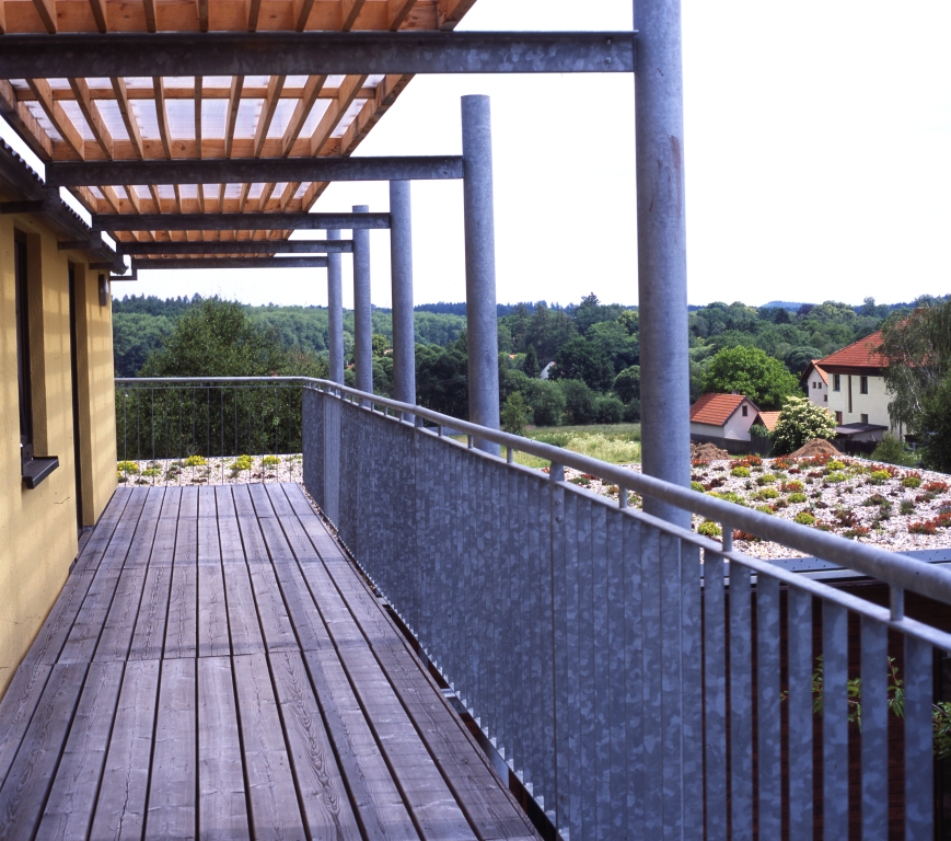 Na mírně svažitém pozemku jsem navrhl dřevěný dům s terasou, obytnou pavlačí, umělým jezírkem a výhledem na panorama zámeckého areálu Štiřín – takovou idylu mají majitelé dřevostavby nedaleko Prahy. Hlavní obytné křídlo má klasickou sedlovou střechu a fasádu zářící do kraje žlutou omítkou, po dominantním točitém schodišti vyjdeme na pavlač, která má nejen obytnou, ale hlavně v létě pasivní stínící funkci - můžeme z ní vstoupit rovnou do obytné haly prvního nadzemního podlaží. ![]()