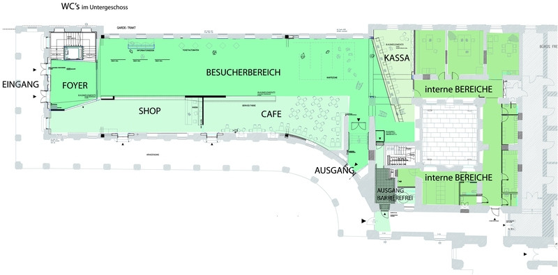 Koncept pro přestavbu je dílem mladého týmu architektů ze Štýrského Hradce "weeSt-graz": Martin Konrad a Katharina Hengel byli vybráni na základě výběrového řízení, konaného v rámci EU z celkem 50 uchazečů, z nichž cirka 35% pocházelo ze zahraničí. Martin Konrad o podmínkách soutěže a konceptu: "Primárně bylo nutné dodržet přísné požadavky zachování světového kulturní dědictví. Aby se dalo vyhovět změně určení prostor, byl nutný rozhodný zásah do jejich současné podoby. Velkorysým otevřením a zasklením oblouků na západní straně se arkády staly recepcí. Velká přijímací hala se rozprostírá po celé ploše jednopatrového prostoru "Gardetraktu". Došlo ke kompletnímu odstranění stěn a stropů, zůstala pouze netradiční zakřivená základní struktura daného prostoru. Vznikly dva světelné scénáře - jeden je tvořen denním a druhý umělým světlem. V denním světle proudí světlo do místnosti třemi skleněnými stropy, které rozptýlí meziprostor ve stropě a promítne do místnosti bodovou strukturou. V umělém světle bude meziprostor ve stropě rovnoměrně podsvícen, body se budou jevit světlejší a místnost bude působit „nižší". Navíc bude strop osvětlen i zespodu."