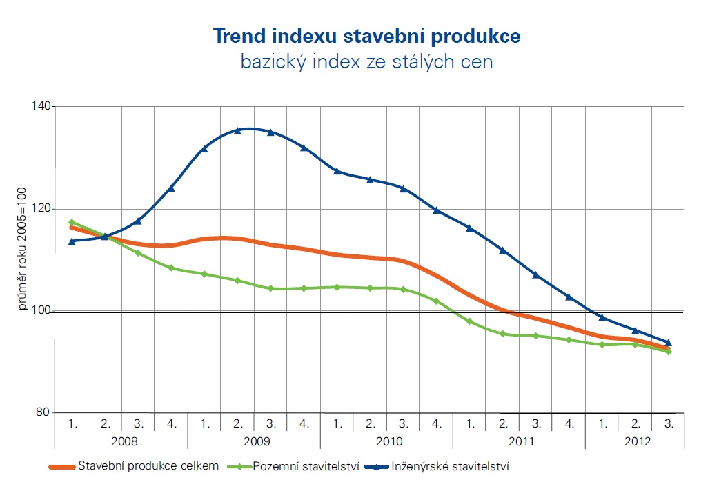 Stavební produkce klesla v lednu až září 2012 meziročně o 6,2 %. Ve srovnání s konjunkturním rokem 2008 se jedná dokonce o pokles o 20,7 %. Negativním tahounem je aktuálně zejména inženýrské stavitelství.