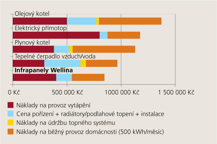 Infrapanely pro zajištění tepelné pohody a požadované teploty vzduchu nepotřebují konvekční proudění vzduchu ani umístění pod okny jako v případě radiátorů. Teplota podlah je mírně vyšší než teplota vzduchu v místnosti a v porovnání s podlahovým vytápěním snižuje tepelnou ztrátu podlahou až o 40%! Výsledkem je eliminace úniků tepla a snížení nákladů na vytápění o cca 30 - 50% v porovnání s přímotopy a akumulačním vytápěním. Ve srovnání s plynovým pak o cca 10 - 20%. Lepších výsledků dosahují pouze tepelná čerpadla, ale u moderní dřevostavby je rozdíl v nákladech cca 3 - 4 000 Kč/rok, v pořizovacích nákladech však zpravidla 100 - 200 000 Kč. Návratnost investice do nákladných technologií TČ přesahuje celkovou životnost samotného zařízení.