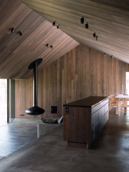 Také interiér je přítulný. Dřevo a světlo pronikající dlouhým střešním světlíkem, vytváří intimní prostor, kterého je dost pro všechny.