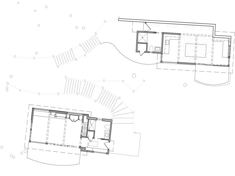 "Rozdělení potřeb majitelů na dvě samostatné budovy umožnilo, aby dvě malé konstrukce byly umístěny lehce a s respektem mezi zdejší stromy," říká Feldman Architecture, architektonické studio ze San Francisca.