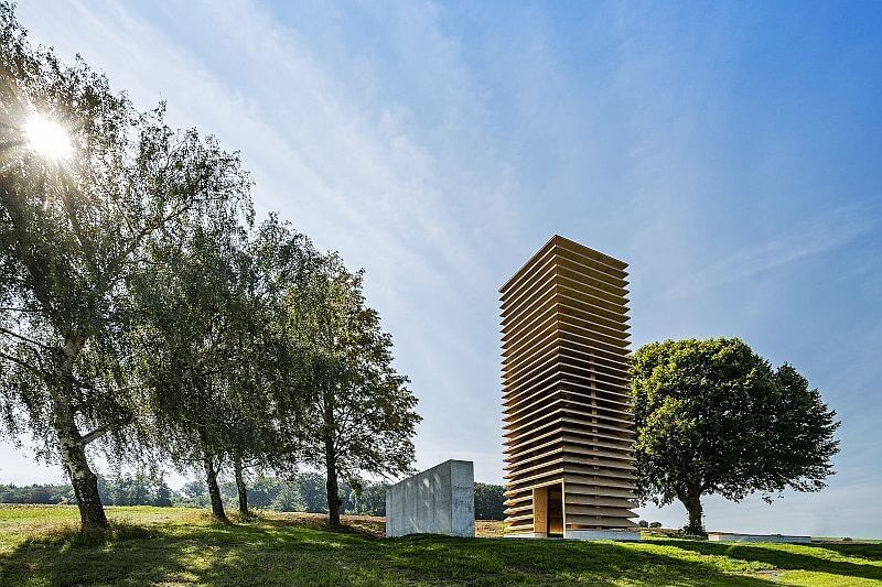 Věž dostatečně vysoká na to, aby byla viditelná z dálky, s tak malým půdorysem, aby se vešla mezi stromy. Čtverec s čtyřmetrovou hranou tvoří čtyři lepené dřevěné sloupy nahoře spojené křížem a opláštěné dřevěnými lamelami bránícími přímému průniku slunečních paprsků.