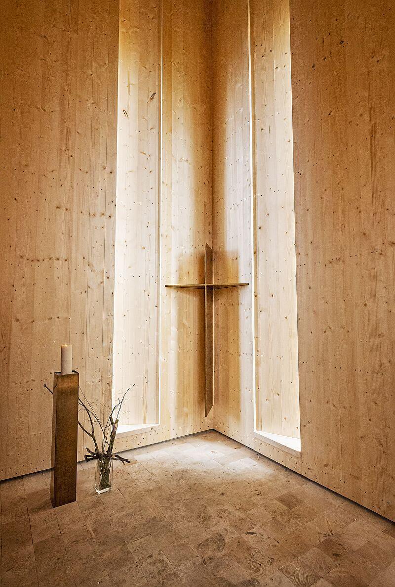 Kaple jako náhodný objev, nikoliv konvenční architektonické dílo. Stavba z určitého úhlu připomíná hranici dřeva a stejně jednoduchá je ona sama: pouze vstup, lavička, okno a kříž. Prostší už to být nemůže. Množství světla je záměrně potlačeno, aby vynikl výhled na vzdálenější kopec a subtilní kříž ve stěně.