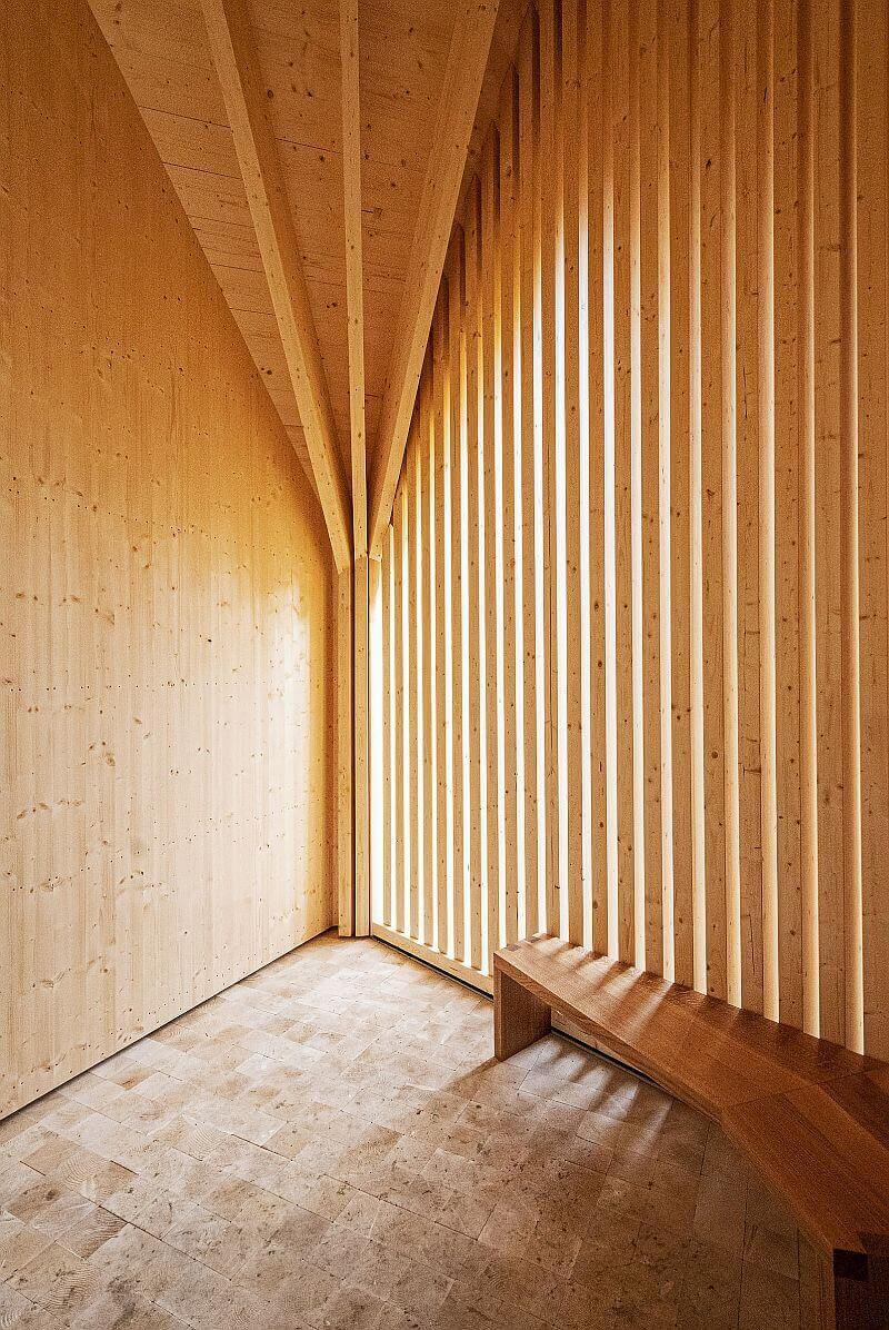 Kaple s čtvercovým půdorysem a strmě klesajícím hřebenem vytváří dojem, jako by byla v pohybu. Opláštění z neopracovaného dřeva a špalíková podlaha jsou vyrobeny z místního smrku. Absence výhledů a měkké rozptýlené světlo dávají příležitost k rozjímání nerušenému vnějšími vlivy.