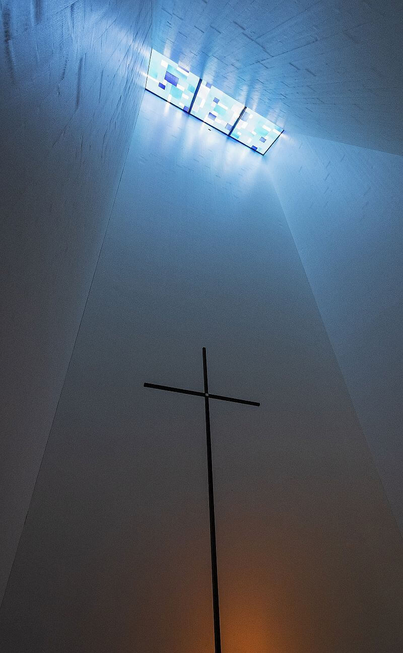 Roubená kaple se strmou střechou je nejkonvenčnější ze sedmi kaplí a jasně odkazuje na gotickou církevní architekturu s typickým poměrem mezi výškou a šířkou. 172 miniaturních okének zasklených modrým sklem vede pohled k zářícímu kříži v průčelí.