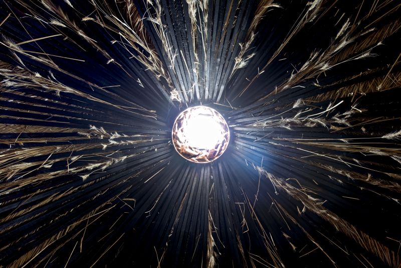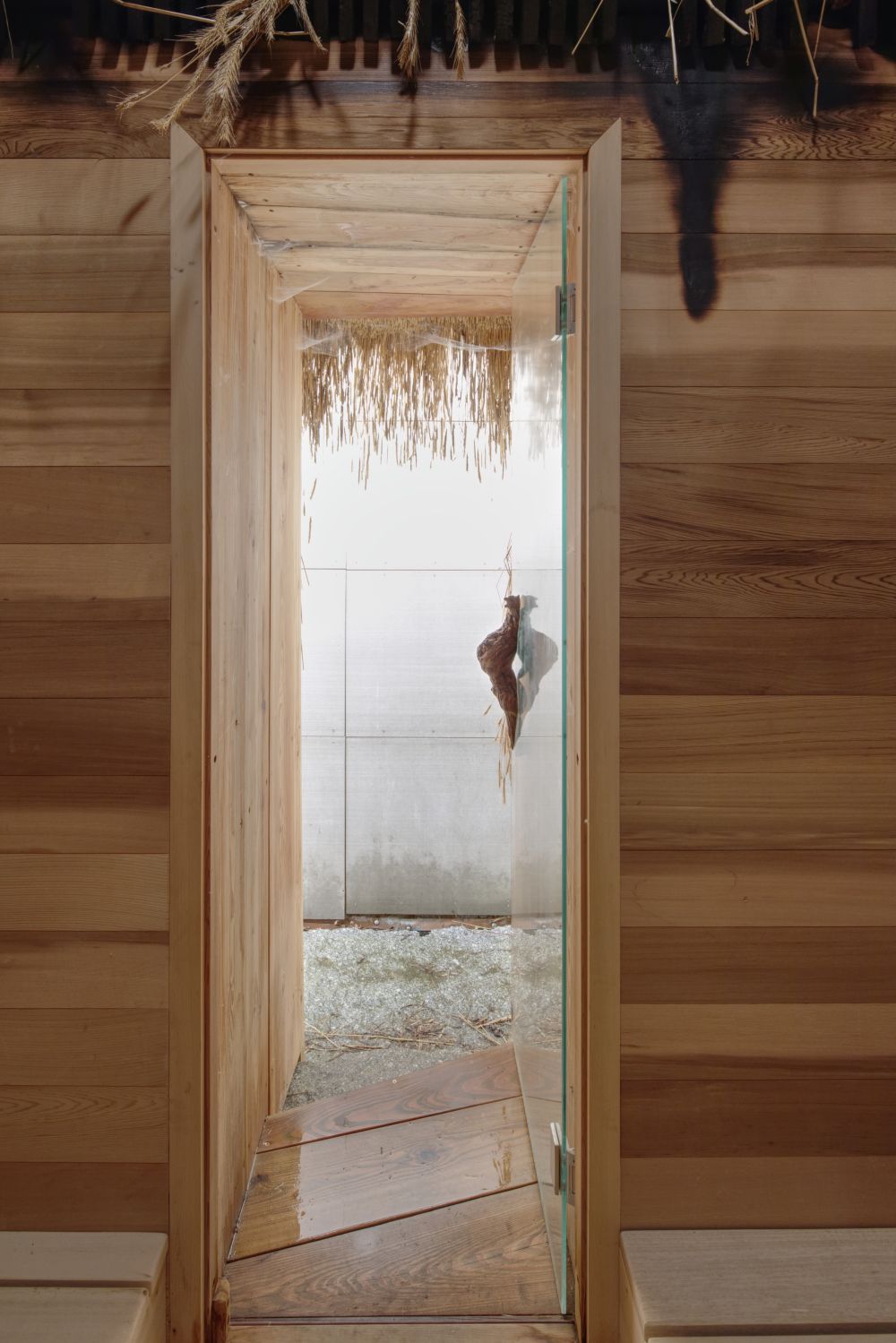 Vnitřní prostor poskytuje zenovou atmosféru díky kuželovitému zakřivení stěn přetékajících plynule do podstřeší s opálenými dřevěnými latěmi. Suché obilné klasy umocňují dojem, že je člověk skutečně zavrtán v kupce sena, zatímco odrazy izolační fólie mezi latěmi pod střechou vytvářejí iluzi, že nad hlavou prosvítá obloha. Ve skutečnosti vstupuje světlo do interiéru přirozeně otvorem pro vrchní světlík vymezený měděným límcem.