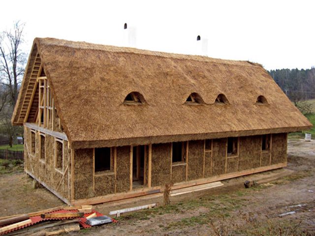 Nosný systém patrového nepodsklepeného rodinného domu tvoří dřevěný tesařský skelet bez hřebíků či jiných kovových spojovacích prvků. Tato kostra domu je vyplněna půlmetrovými vrstvami slámy, které jsou potažené vnitřními i vnějšími hliněnými omítkami a nahozeny pískovo-jílovým štukem. Vnější omítka je tvořena pomocí králičího pletiva na dřevěných sloupcích nebo přímo na balících slámy, na které je nanesena směs rozředěné jílové hlíny, hnoje, pilin, slámy a písku. Stěny byly nakonec natřeny vápenným nátěrem, který jim umožňuje dýchat a přirozeně pracovat s okolními teplotními podmínkami. Střecha slaměnky je vyrobena z rákosových vrstev silných 40 cm a ve špici je po celé délce zabezpečena šindelovým krovem.