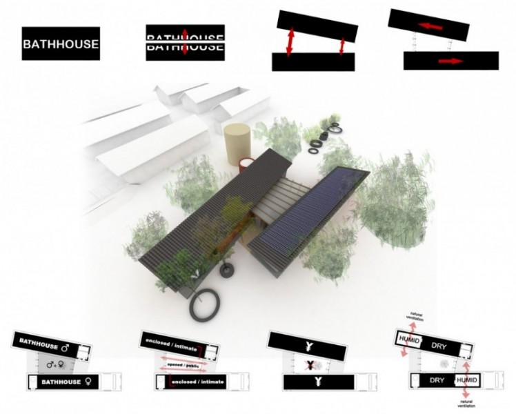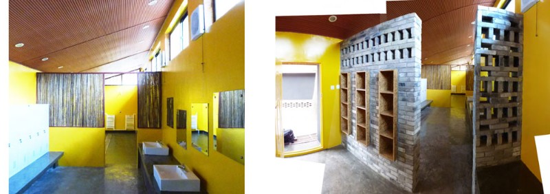 Z prostoru společného atria vstoupí návštěvník do vstupní části, kde se přezuje. Ve středu dispozice na něj poté čekají převlékací kabiny a umyvadla, v zadním úseku pak celkem 12 sprchovacích míst. Okna v horní části místností poskytují naprosté soukromí a přitom zajišťují dostatek přirozeného osvětlení a hlavně dostatečnou ventilaci vyprodukované vodní páry. Uspokojivé přesahy střech pak chrání budovu před přehříváním a prudkým deštěm. Aby se stavba stala jedinečnou a identifikovala se s místním prostředím, dali architekti prostor všem uživatelům vyjádřit svůj názor nebo se zkrátka jen pobavit – stěny jsou obloženy černou školní tabulí, na kterou mohou všichni otisknout své pocity pomocí barvených kříd.