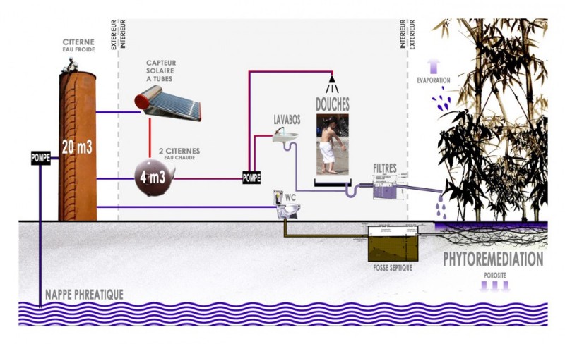 V oblasti s neexistujícími vodovody a kanalizacemi, musela být stavba vybudována jako zcela autonomní jednotka, nezávislá na svém okolí. Vodu tak čerpá a schraňuje v tanku s objemem 20 m3 a ohřívá jí pomocí 100 m2 solárních panelů. Znehodnocená voda je odváděna do kořenové čističky odpadních vod, kde bakterie žijící v kořenech bambusu zabíjejí mikroby obsažené ve vodě a do přírody tak vypouští už jen čistou a nezávadnou kapalinu.