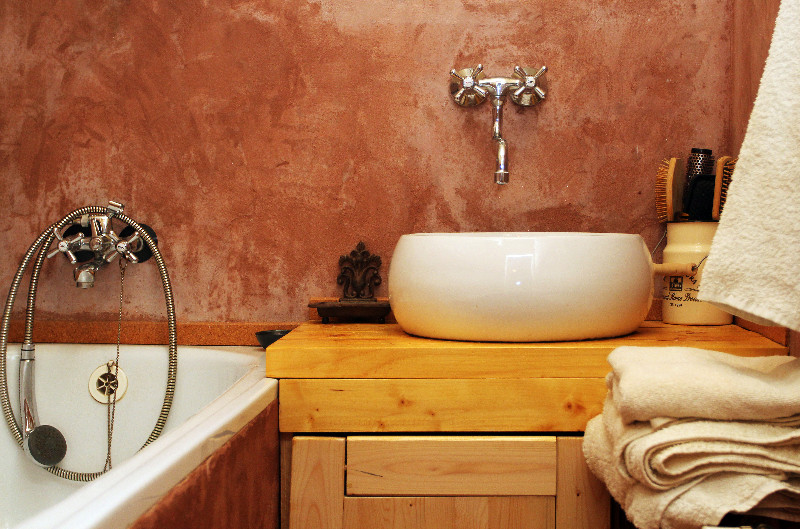 Zvláště když se dozví, že hliněnou omítku lze použít třeba i v koupelně, kde většinou dominují keramické obklady a silikon. Zní to možná překvapivě, ale hlína má pro tuto aplikaci velkou přednost: dokáže regulovat vlhkost, která při koupání vzniká. Pokud se omítková směs doplněná vápnem správně zpracuje, vyhladí a opatří ochranným nátěrem, tak jí nevadí ani ostřikující voda. Rozhodně tedy není třeba omítku každou chvíli obnovovat. Přesto je třeba brát voděodolnost takto zpracované hliněné omítky s rezervou. Pokud bychom na ni pustili silný proud vody, tak se rozmočí. Avšak při běžném koupání ve vaně, která je dokola omítnuta hlínou, takové následky nehrozí.