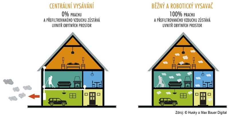 Jako jediný z uvedených typů totiž centrální vysavač odvede vzduch mimo dům a jemný prach zachytí ve filtru. Klasický přenosný i robotický vysavač proti tomu vzduch i se jemným prachem vyfouknou zpět do místnosti. A jemný prach navíc ještě zvíří do vzduchu. V podstatě se s nimi tedy sice zbavíme hrubých prachových částic a nečistot, ale ty nejjemnější, společně s alergeny, v místnosti pouze rozfoukáme. To mimo jiné znamená, že musíme mnohem častěji nejen znovu vysávat, ale i daleko častěji utírat prach z nábytku.