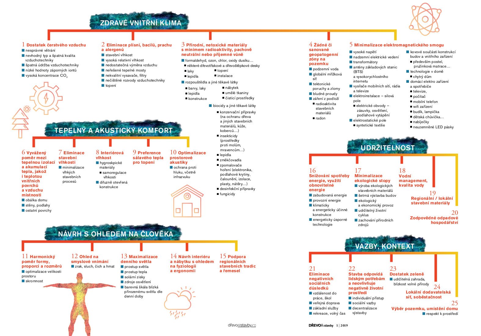 V následující myšlenkové mapě najdete pětadvacet základních bodů standardu, který pokrývá mimo jiné i fyzikální, chemické a mikrobiologické faktory bydlení, a také u každého standardu i nejčastější patogenní zdroje. Pokud se je rozhodnete přijmout za své, bude to pro vás jako budoucího uživatele domu obrovské plus proti konvenčním spotřebitelům, kteří tyto zásady neuplatňují. Biologie budov je totiž průkopnický výzkum, který vnáší do pravověrné vědy skutečný život.