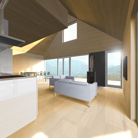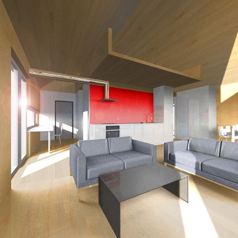 Základem vnitřního uspořádání dřevostavby je myšlenka přízemního domu, v jehož části půdorysu je umožněn růst i do prostoru pod střechou. Dřevostavba má pak po započtení této plochy celkovou výměru až 108 m2. V přízemí v sobě dům obsahuje rozměrově i uspořádáním dispozici ne nepodobnou bytu 3+kk. Celkově je obytný prostor dřevostavby příjemně vzdušný díky „loftovému" řešení a také svému otevření se do prostoru pod střechu.