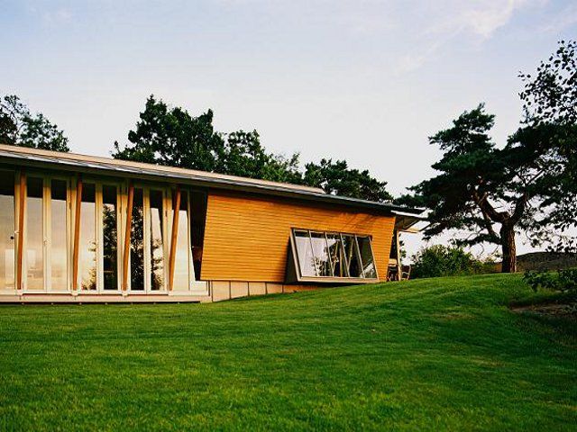 Jednotlivé místnosti domu spolu komunikují přes nejdůležitější pokoj v domě. Zbytek budovy je v kontrastu s předním proskleným štítem a jednou velkou skleněnou plochou s dřevěnými sloupy relativně uzavřený. Koncept stěny domu je úmyslně narušen řezem, čímž se dosahuje dojmu lehkosti, hravosti, dynamiky a pohybu. Fasády celé budovy jsou obloženy dubovými prkny, střecha je zinková. Chata je dílem architektonického ateliéru Jarmund/Vigsnæs AS Architects MNAL, o jehož projektech je možné se dozvědět více na výstavě Arch Cities v 1. patře pražského letohrádku Belveder do 23. října.