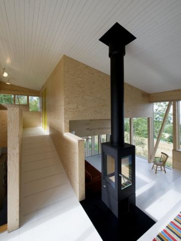 Prostorové uspořádání, odhalená konstrukce a materiálová jednoduchost stodoly inspirovala i novou dřevostavbu. Od hlavního vchodu k jihu má vnitřní uspořádání dvojí zaměření: obě otevírají celou severní fasádu k jezeru a současně snižují ústřední prostor směrem k terase na západní straně domu. Řada společných prostor na této sestupné ose je vizuálně propojená po celé délce domu. Nahoře v podkroví je dětský pokoj, pod ním prostory obývané rodiči. Hlavní část vyrůstá směrem k jihu tak, aby do budovy mohlo svítit i nízké zimní slunce. Prosklená zimní zahrada funguje v zimě jako zásobník tepla, v létě chrání zbytek domu proti horku.