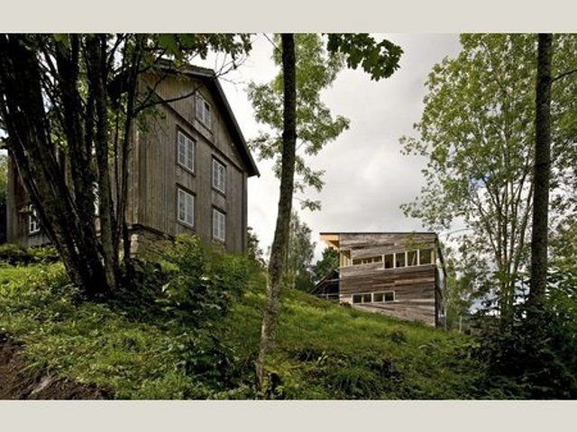 Na břehu jezera Mjøsa, na místě opuštěné farmy, kterou zdědili, vznikl dům pro rodinu: pro dva historiky a jejich děti. Původní starý dům, který stojí nedaleko na pozemku, je využitý zčásti jako bydlení pro hosty a zčásti jako sklad. Dřevěné stodola vedle se musela strhnout, protože měla prohnilou nosnou konstrukci. Zachovalé, přes sto let staré dřevěné obložení stodoly však bylo použito na venkovní obložení domu a teras. Několik starých fošen se rozřezalo a použilo na stavbu střechy. Tyto diagonály drží oplechování v horizontální poloze vůči sklonu střechy.
