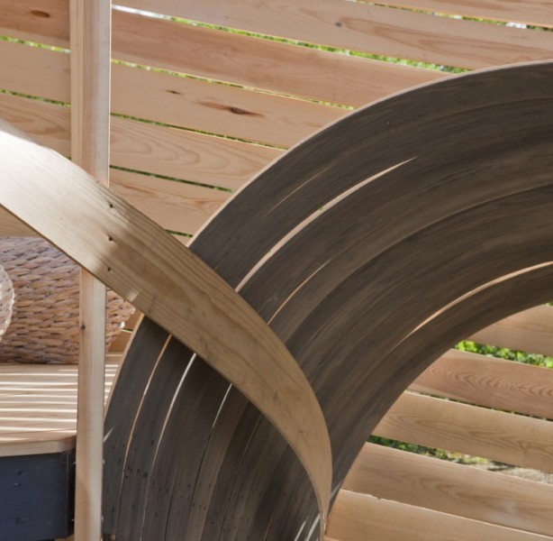 Tvar atria lichotí temperamentu dřeva – technicky se samozřejmě jedná o část návrhu, který je pro konstruktéra největší výzvou, z hlediska uměleckého podněcuje lidskou představivost. Dlouhé, zakřivené borovicové lamely napůl zakrývají patio a formují treláž, díky níž dvorek ožívá okouzlujícím a závratným způsobem. Treláž chrání dvorek před větrem a filtruje dlouhé paprsky nordického slunce. Šarmantní hra světla a stínu může být pozorována během dne, od chvíle kdy lehké ranní paprsky postupně gradují a mění se ve žhoucí kotouč vysoko postaveného poledního slunce.