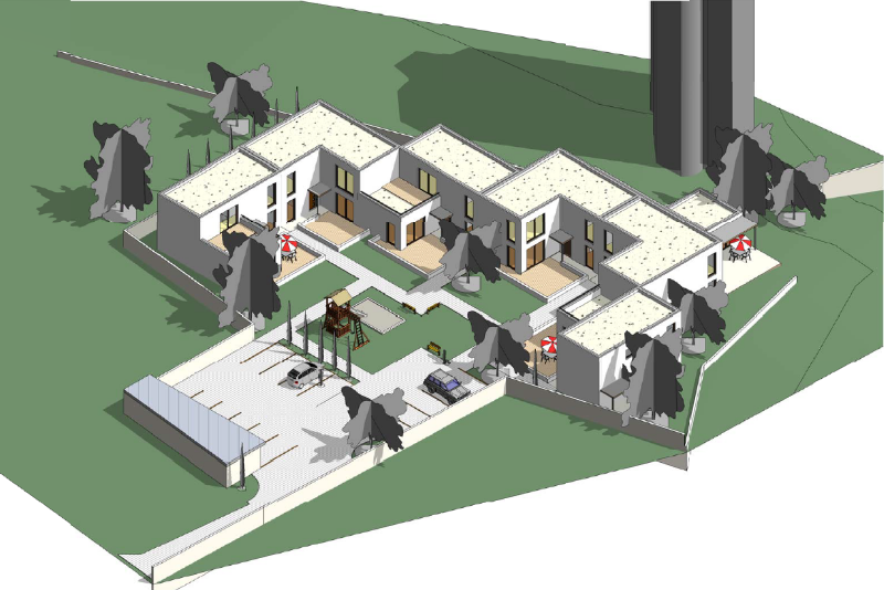 Proto velkou pozornost věnovali také návrhu exteriéru obytného souboru, kde vytvořili víceré funkční zóny (společenská místnost s exteriérovým krbem, dětské hřiště, odstavné plochy pro auta, skladové prostory). Projekt počítá i se sadovými úpravami tak, aby obyvatelé souboru žili od prvního dne v pěkném prostředí.