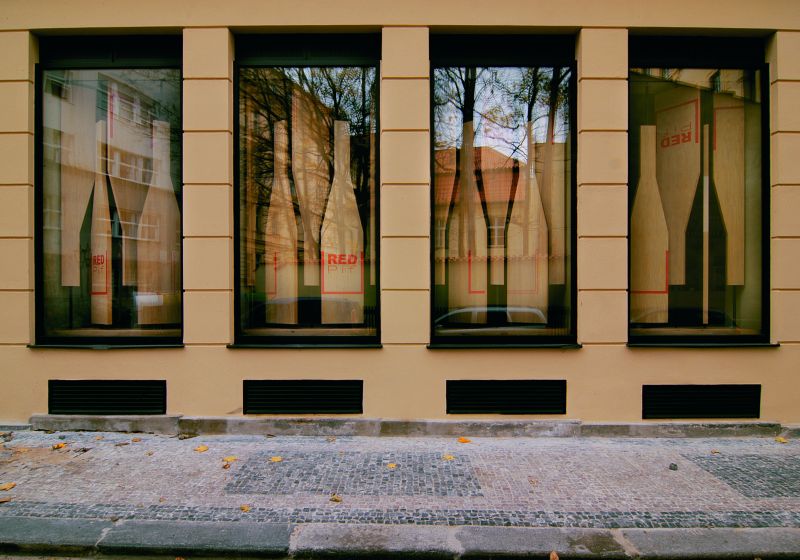 Do exteriéru pražských ulic se jejich dílo propisuje otočnými paravány ve tvaru vinných lahví, umístěnými ve velkých výkladcích. Ty mohou poskytovat kontakt s vnějším světem, nebo se naopak uzavřít a vytvořit uvnitř prostředí vinného sklípku. Ani v tom případě však nezůstanou pro kolemjdoucí slepé, protože se změní ve velké logo podniku.